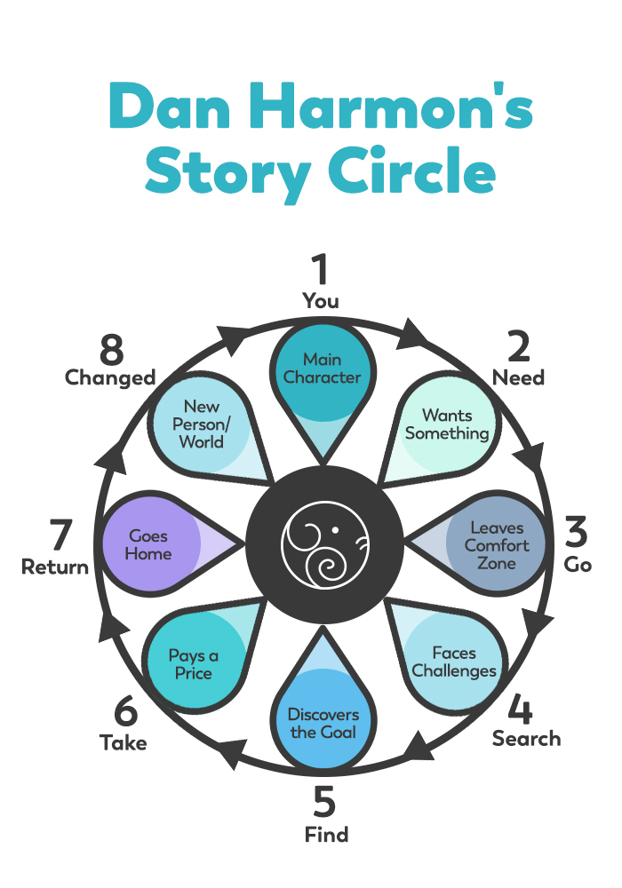 Dan Harmon, the creator of shows and movies such as Community, Monster House, and Rick and Morty, uses what he calls “the story circle” as he writes scripts. Instead of 17 steps, Harmon cuts it down to just eight.